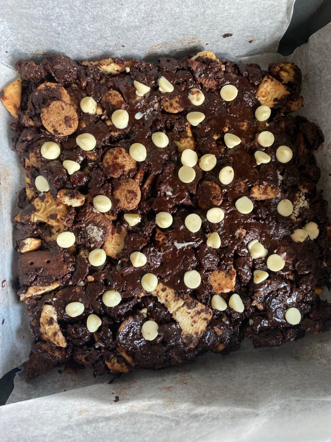 - Taking the bowl off the heat, fold in your biscuits, fruit and if using them any cereals or chopped nuts until they are coated in the chocolate.